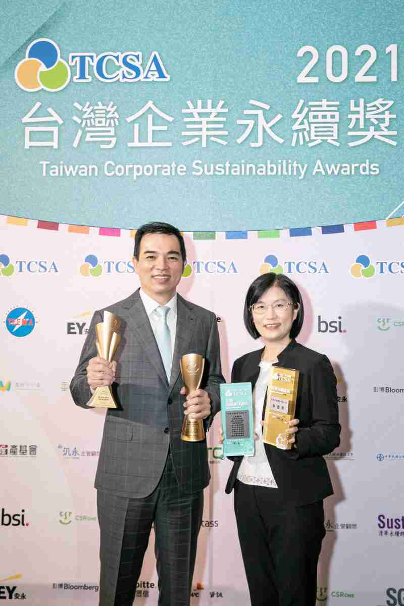 达在台湾永续奖所评比环境、、社会、、、、治理等各面向的永续绩效均获高度肯定 (左:开云电子光电总经理暨营运长柯富仁,,,右:开云电子光电永续长古秀华)