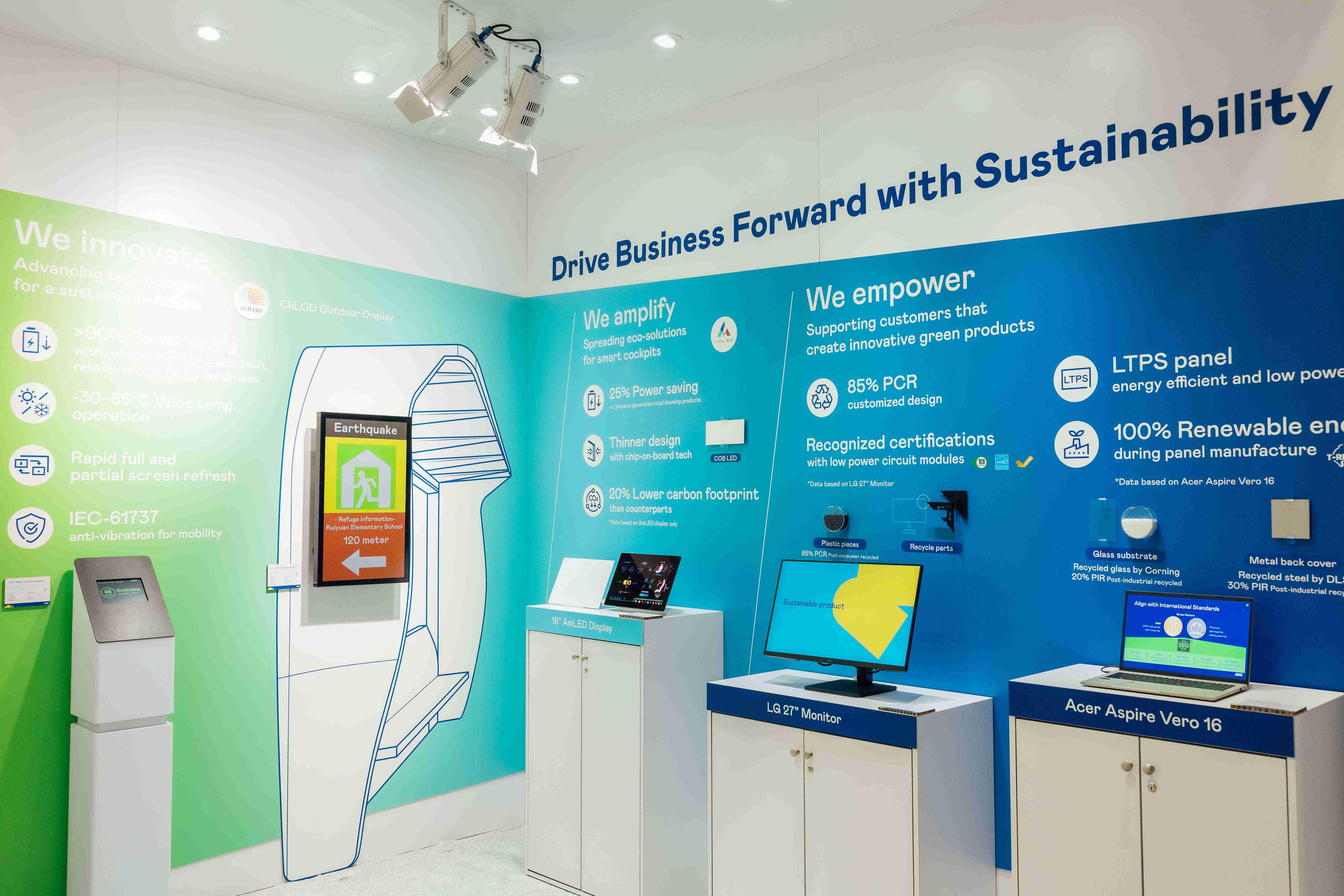 开云电子运用创新显示技术HiRaso胆固醇液晶双稳态技术达到显示零耗能、、、扩大节能省电的AmLED显示技术应用于车用产品、、、、以再生的消费后回收(PCR)塑料及全绿电生产之面板,,,,应用于笔电及萤幕,,增加绿色价值。。。