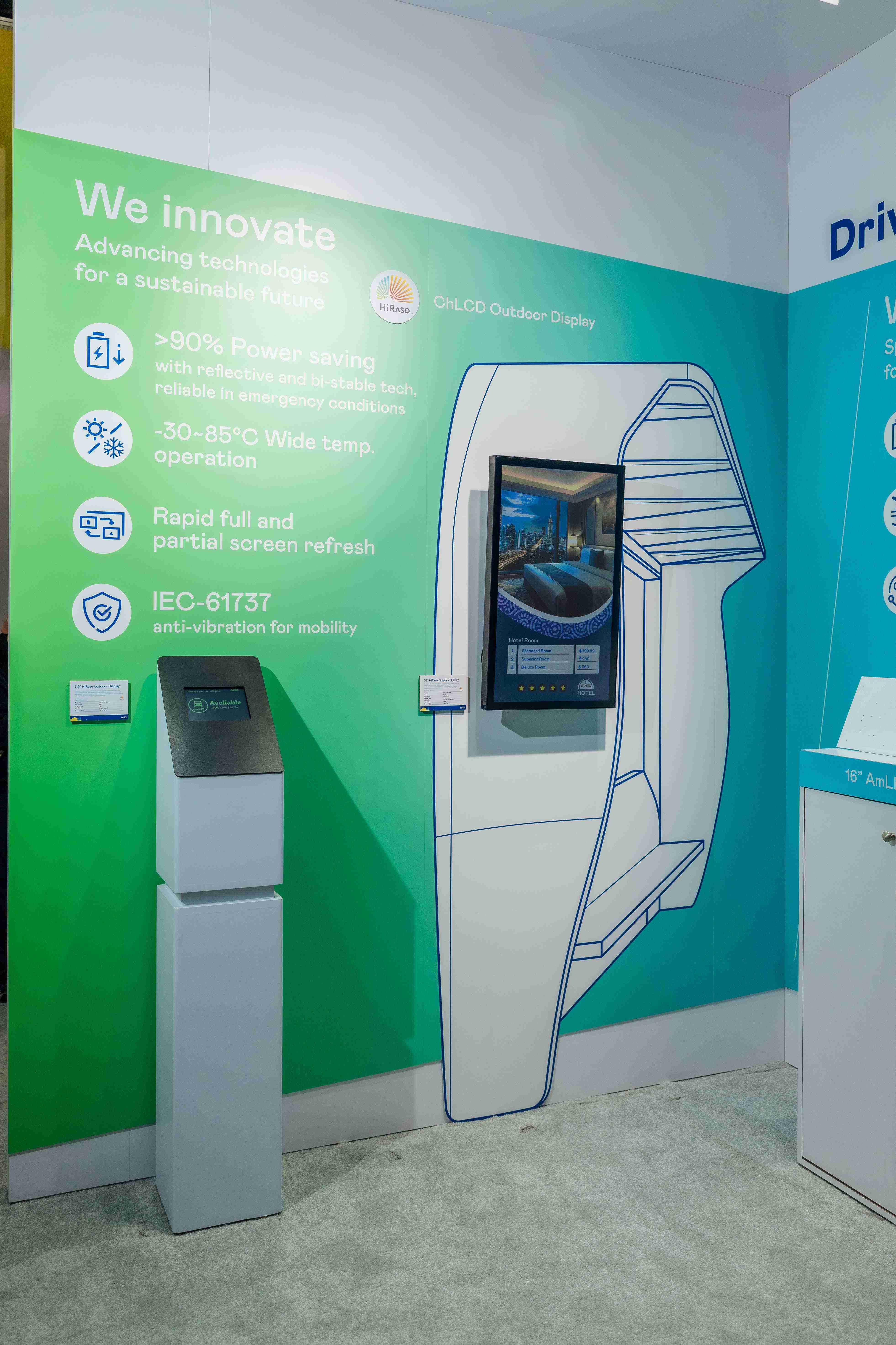 HiRaso胆固醇液晶显示器运用反射环境光线的方式,,,,呈现影像显示时零耗能的环保省电诉求,,,,光线愈强愈能呈现绝佳的色彩饱和度及显示效果,,,同时在摄氏-30度至85度间宽温的使用优势,,为户外电子看板的新首选。。