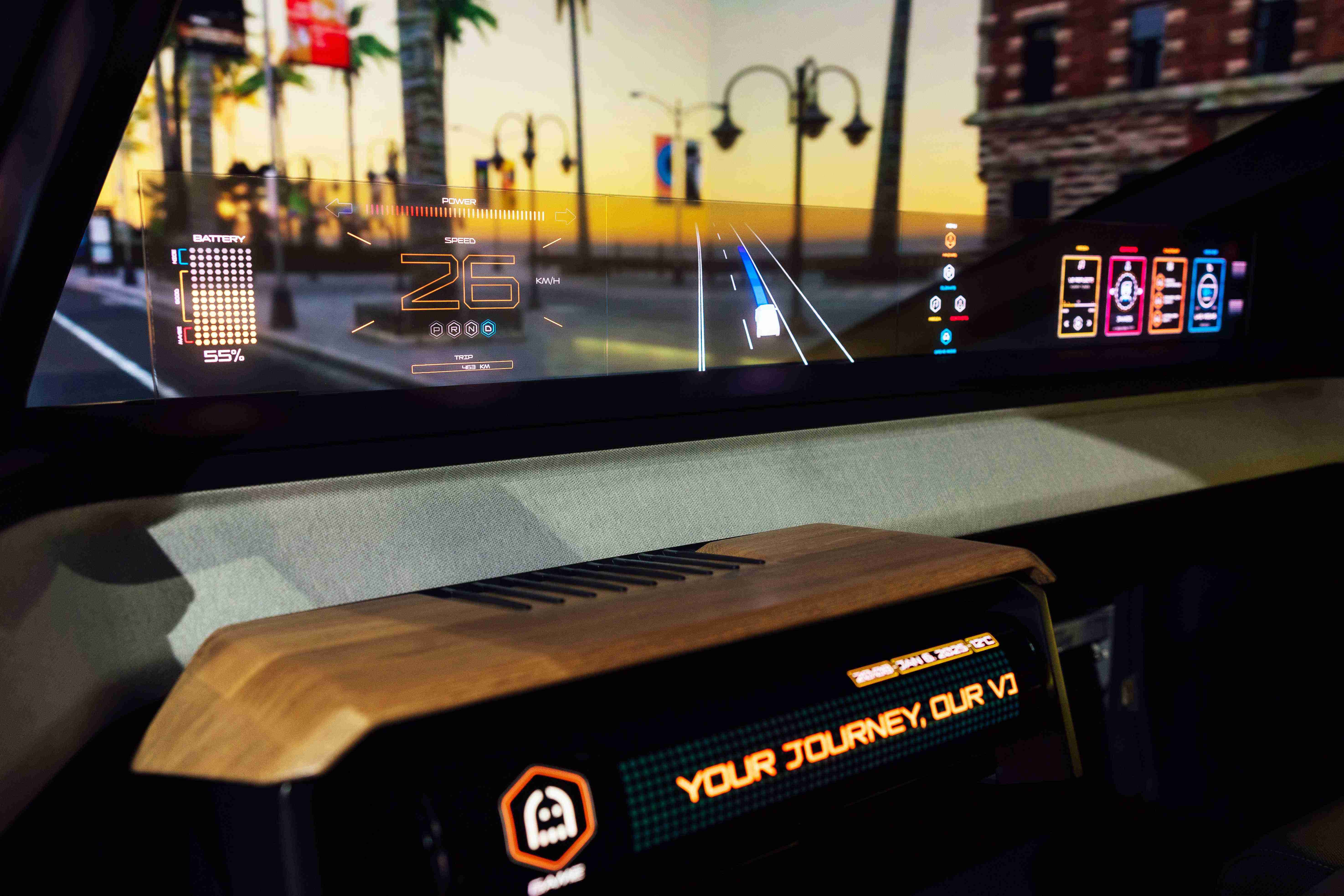 车用运算方案驱动无界透明显示介面(Horizon Image Glass),,整合仪表板、、中控及副驾显示功能为一体式全景呈现,,不仅提供清晰的外部视野,,,,亦能即时显示车辆状态、、、、导航及路况资讯,,,并赋予个性化设定与驾驶安全警示等加值化服务。。。。